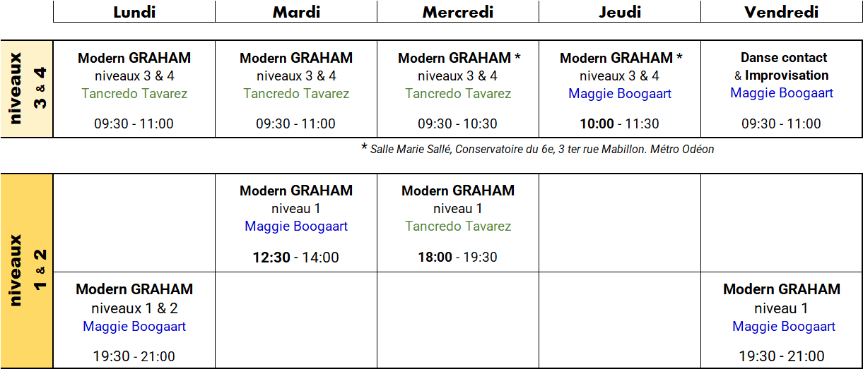 registrationLevel 1 and 2 classes taught by Maggie Boogaart. Daily classes levels 3 and 4 of the Paris Marais Dance School's advanced professional training program, taught by Maggie Boogaart and Tancredo Tavarez.